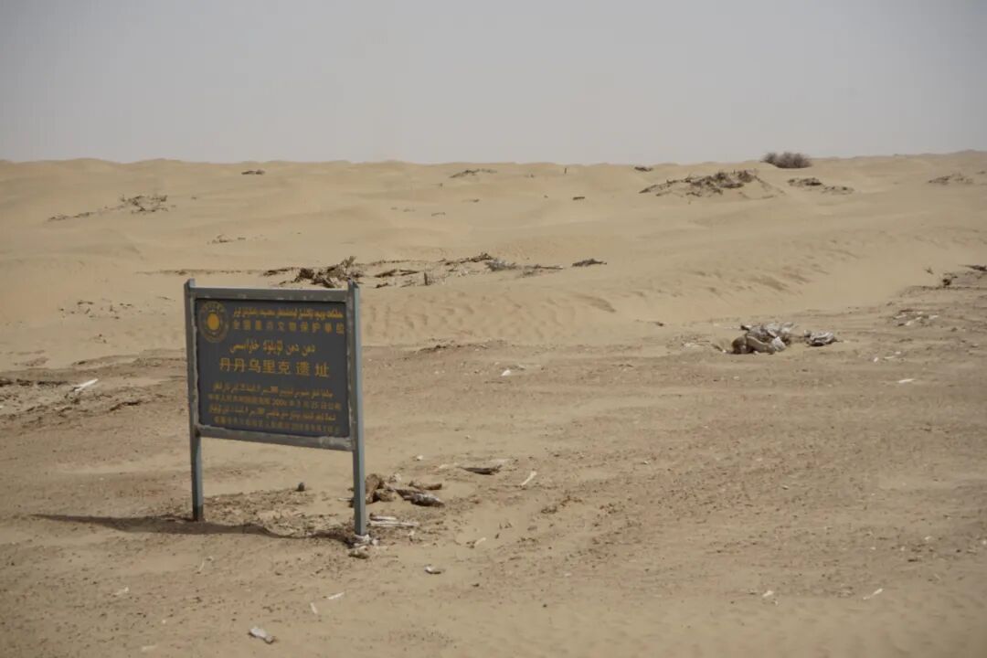 沿着起起伏伏的沙丘,跋涉了大约一公里,远远望去,在广袤无垠、黄沙漫天的塔克拉玛干沙漠腹地,残存的建筑构件在风沙的侵蚀下倔强地挺立,默默诉说着昔日的繁华与辉煌,这就是丹丹乌里克遗址。